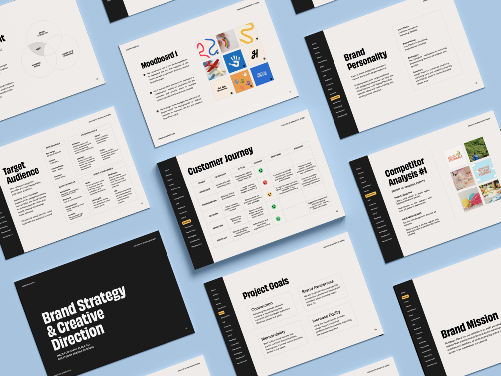 Once you’ve nailed the strategy, move on to the Brand Presentation (Step 2) to present the new identity to your client, and the Brand Guidelines (Step 3) to deliver the rules of the final identity so they're never stuck on how to use it.