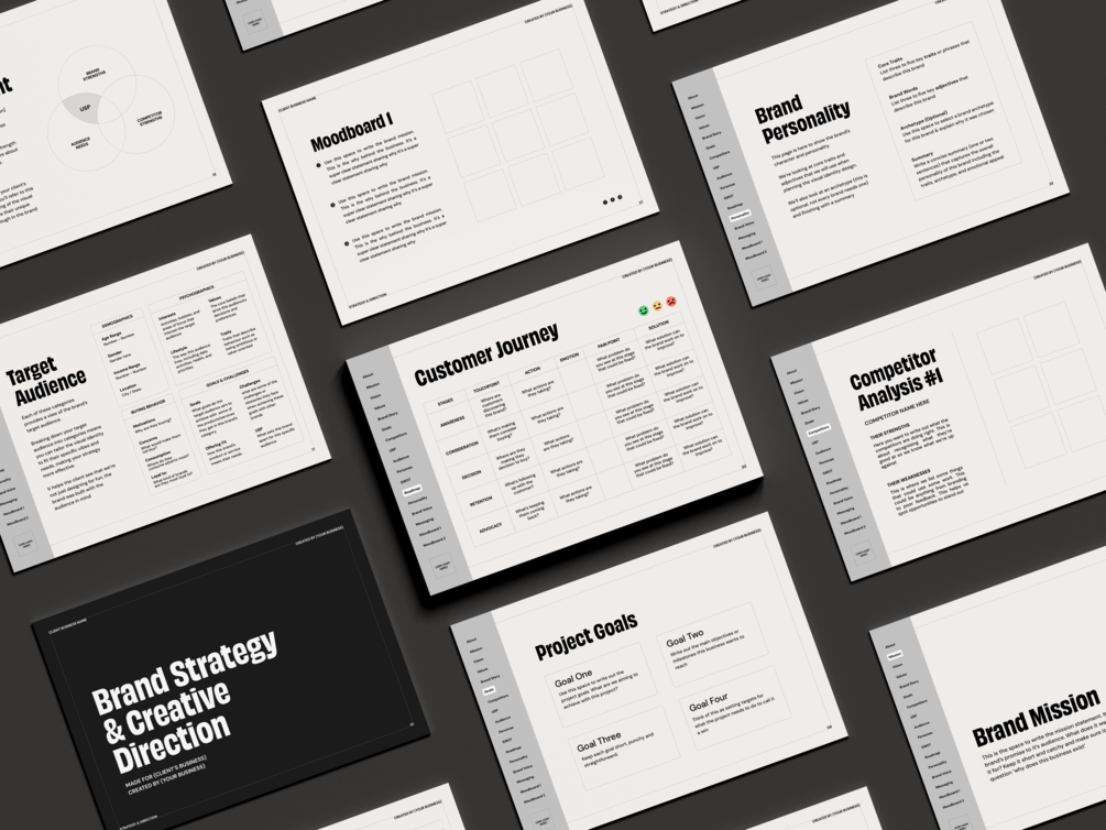 - Strategy Section including pages for the brand mission, vision, values, audience, competitor analysis, brand personality, customer journey, brand story and more